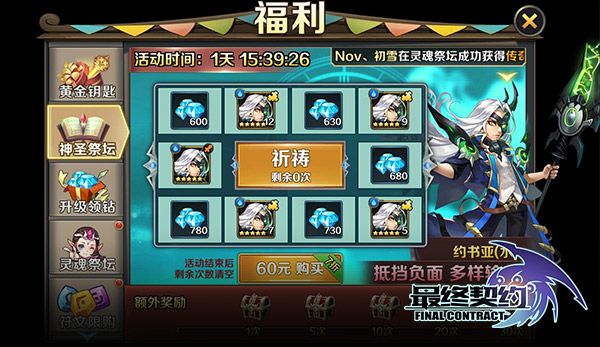 除了全新英灵、天赋系统及公会战玩法之外,《最终契约》年度资料片也为大家准备四大福利活动:不仅每天登录领取可以神秘召唤卷轴,神圣祭坛还将限时抽取约书亚碎片,抽取指定数量即可召唤出最新的SSR传奇英灵——约书亚来为你战斗哦!
