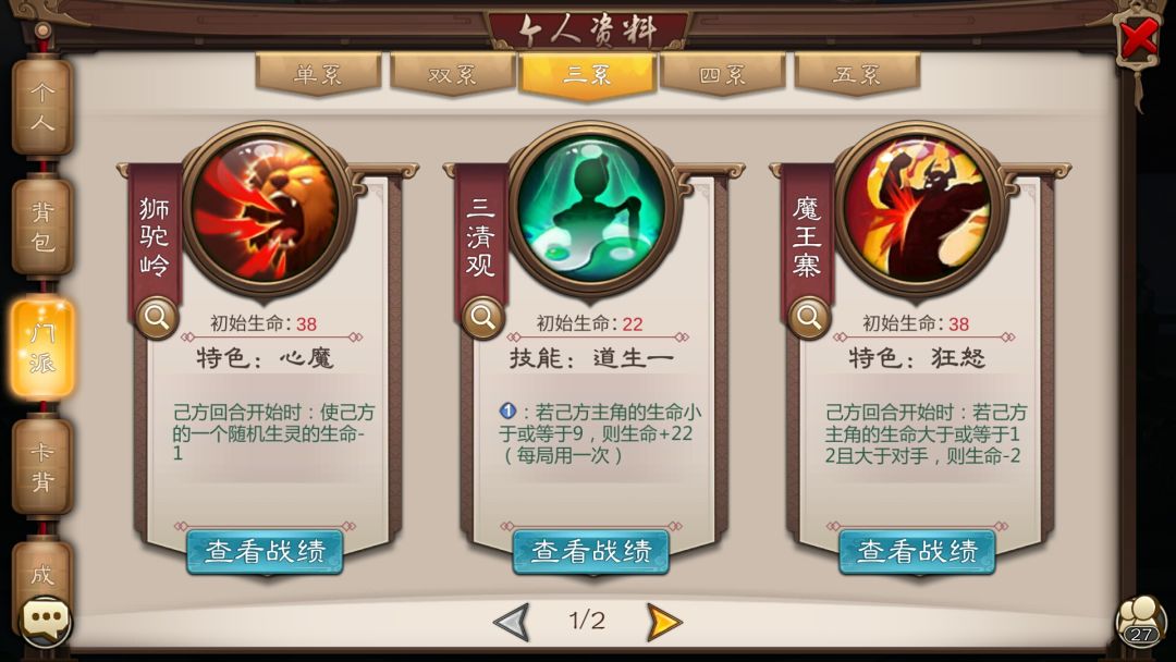三清观的门派特性是低血量与回光返照。总的来说就是控血。毫无疑问,目前利用双方生命差获得胜利的只有涨心雷(掌会被和谐)一张卡。其装上仙汤使用法术后余下的法力值也能用于使用门派技能。