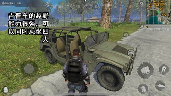 分析介绍:吉普车同样拥有不错的越野性能,爬坡能力只比山地车稍差一些。吉普车可以同时乘坐四人,但因为没有车门作为掩体,防护能力一般,容易被两侧敌人击中,但相对的车上玩家也可以直接反击。在四排或者双排中推荐利用吉普车赶路。