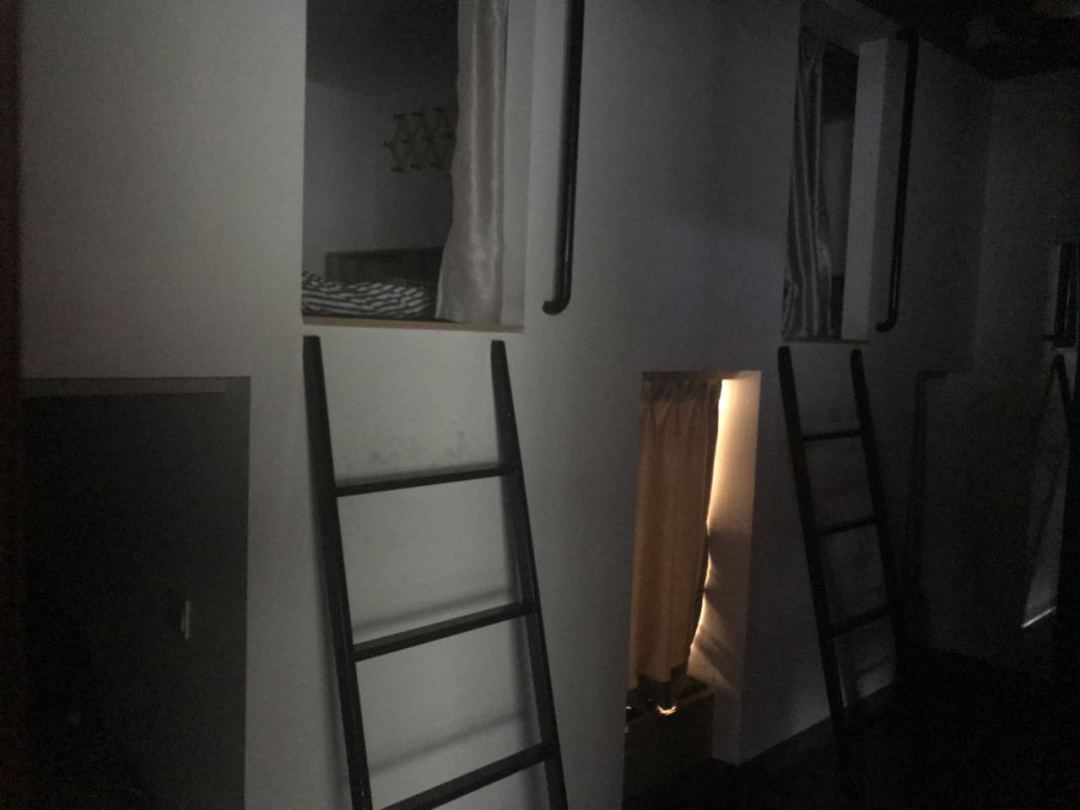 这是我们的胶囊公寓,因为拍摄的时候有人在休息开灯会打扰到,所以只拍到了这么一张像是会出现在恐怖电影里的照片,大家不要怕,怕的话就背诵两遍八荣八耻。