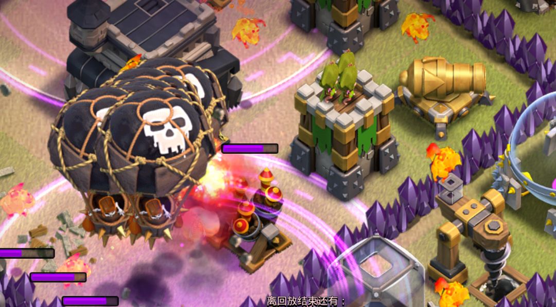前面说过,除了X连弩,其他所有建筑都可以在气球的两次撞击后被摧毁。因此面对周围零零散散的建筑,我们可以两两结对,争取两只气球只受到一个建筑的攻击,以保证生命值健康。由于X连弩都在阵型中心,再加上需要三四次撞击才会被摧毁,因此不适合这个清边打法。