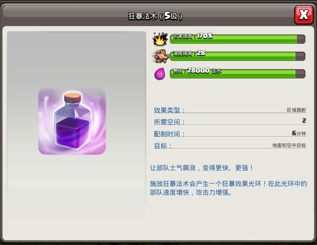 而狂暴法术本身占两个法术位置,如果法术工厂的法术储存容量是奇数,则可以带一个急速法术,可以理解成没有伤害加成的狂暴药水。也可以带一个冰冻法术或者部落城堡中求援一个冰冻法术,面对法师塔与地狱塔有不错的效果。