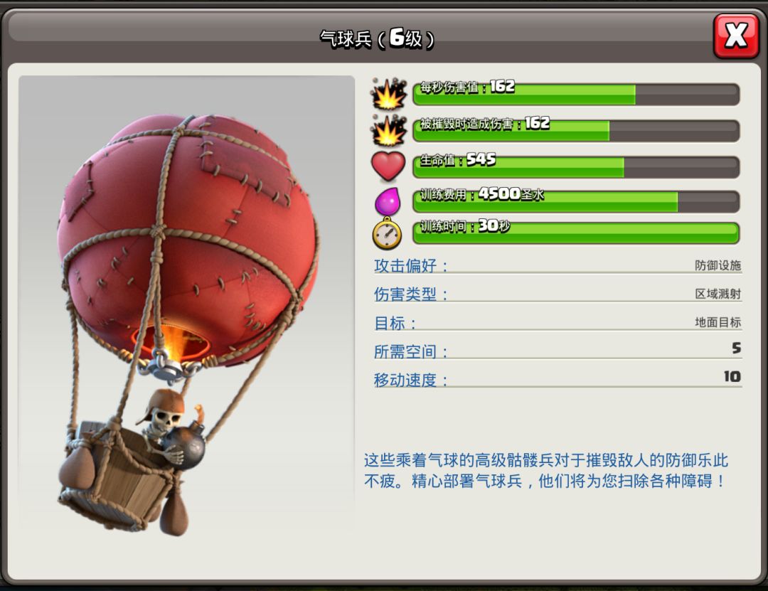 介绍“狗球流”就不得不先介绍一下气球的伤害,以九本为例,六级气球每秒平均伤害是162, 4s撞击一次,一次的伤害为648。在面对同本满级建筑中,除了X连弩,所有建筑都可以在两下撞击后被摧毁。其中若气球撞击迫击炮或炸弹塔一次,然后被打爆炸,就可以触发死亡后的掉落伤害,直接摧毁迫击炮或炸弹塔,大家可以记住这个小窍门,以后来欺负这俩不能防空的建筑。