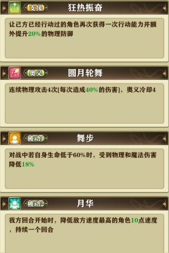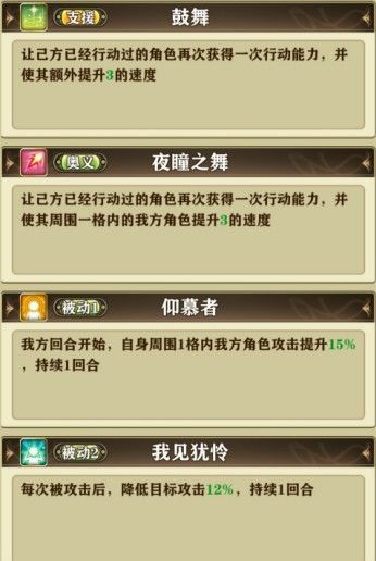 之所以评价红舞给人超模的感觉,就是因为她在已经有再动这个核心技能的情况下,还有被动1这个 高百分比 的 被动 范围 加攻BUFF技能。15%-20%,在加攻BUFF中算很高的,在辅助中是最高的。在此之上,这还是个范围技能,能给周围包括红舞自己上BUFF。有了这个技能满觉下20%的面板攻击,红舞自己作为输出都在常规输出之上。这还没完,这还是个被动技能,只要在身边,回合开始就自动加。。。大部分加攻BUFF已经哭晕在厕所了。另提一嘴,这个持续一回合和曼狄的一样,是持续到第二回合我方回合结束,也就是说接近两回合的BUFF效果。。