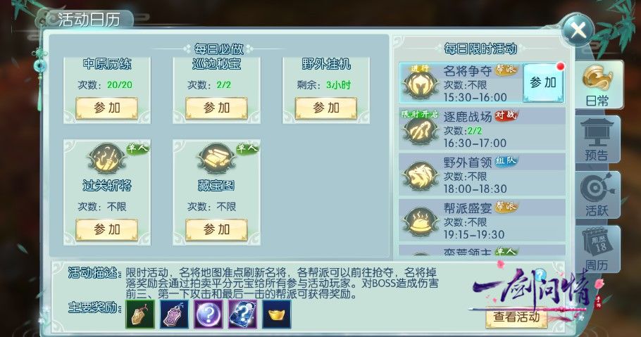在《一剑问情》中每天的15:30-16:00和22:00-22:30会开启名将争夺活动,在特定的几个活动场景刷出多个名将BOSS,玩家可以前往讨伐,活动场景中强制切换为帮派PK模式,BOSS被击杀后会根据击杀情况给予各帮派奖励,奖励将发放到帮派拍卖中进行拍卖,参与活动的成员可获得拍卖分红。