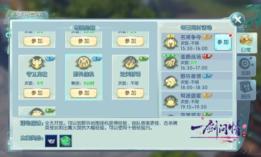 玩家达到20级正常开启“野外修炼”功能,活动日历界面正常添加“野外修炼”功能;点击“野外修炼”活动,正常显示活动描述和主要奖励