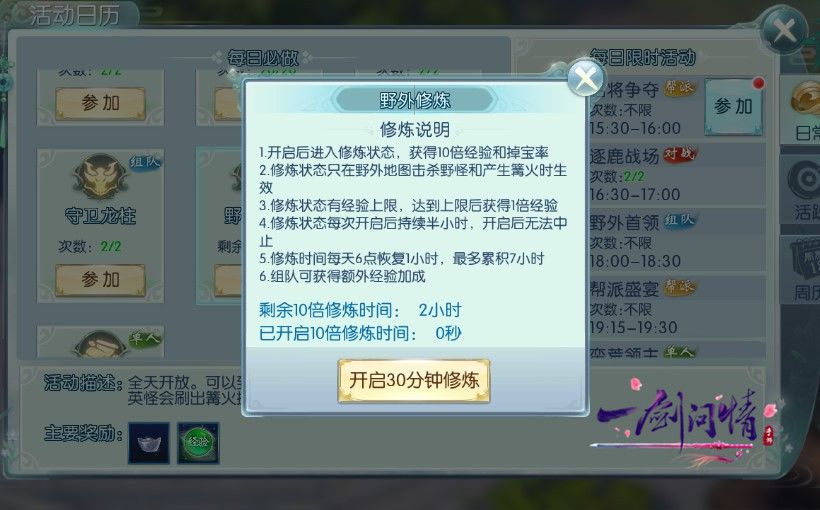 1. 玩家每天可在活动日历面板领取2小时的修炼时间;