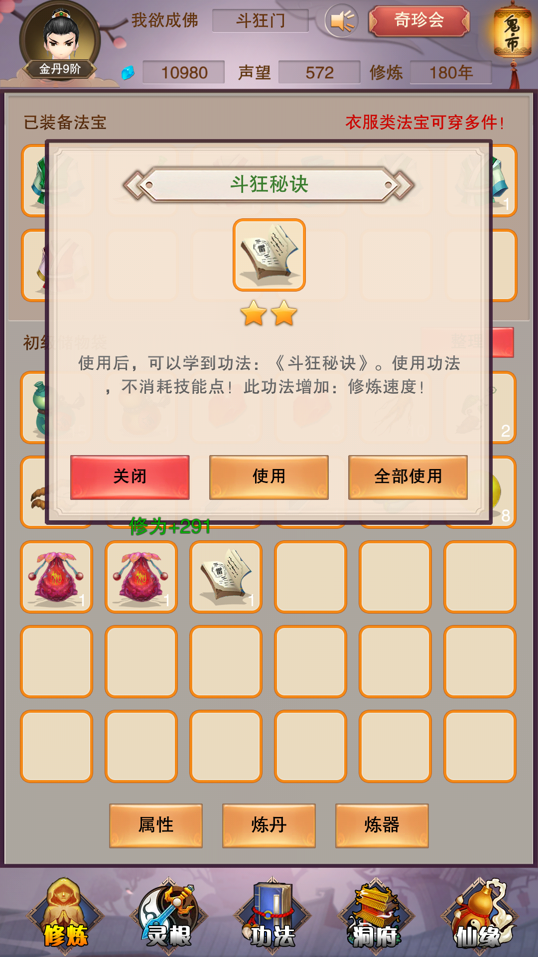 如题,买了一个信物,提示木灵根不够就一直升木灵根,加进去以后传功的能看到只需要100贡献就可以免费学习一个功法,学了以后效果如下,可以啊,修为速度增加。。666,还有2个信物买了进去看看