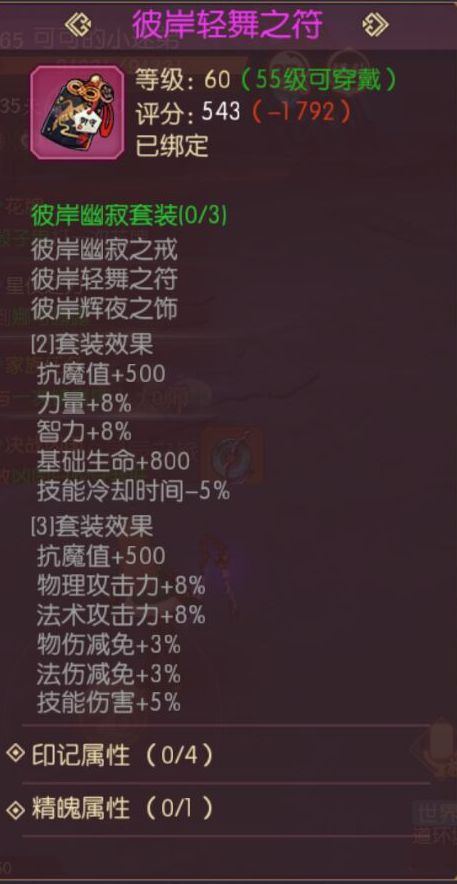 彼岸首饰单个加抗魔并不多,但是综合起来可以加2800抗魔,对于65防具的强化,仅仅需要一件+12即可到7000抗魔!