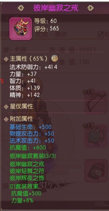 当然了,对于很多童鞋对于小号不想过多的打造,但是又害怕伤害不够,以免造成金币的浪费,我这里推荐第二套抗魔套装:65防具+彼岸首饰套装。