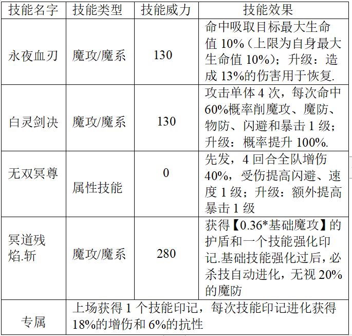 解析:震惊!合体宠沦落成打工仔...初步一看技能机制倒是没有太大问题,印记增伤18%*4+属性技能增伤40%还算可观的伤害;魔族嗜血+1技能转化13%造成的伤害和最大自身10%的体力值还算不错,然后就是抗性的防御也可以参照一下修凯,在2v3的情况下能够很快叠加暴击,伤害不够金鬼来凑,我不喜欢无脑黑...缺点可以参照一下天使王,可以削闪避也不算太瞎,没有魔攻加成注定不能伤害最大化,我不喜欢无脑黑,PVE中规中矩,如果您是PVE玩家资源比较少的情况下我推荐不练.