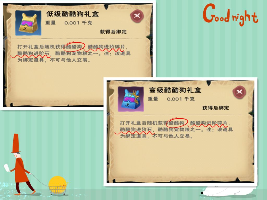 (由于礼盒获取时间难度太大,这里卿给出100个礼盒的测试数据,高级酷酷狗礼盒的爆率是14%左右的酷狗进化石,1%左右的酷狗道具)