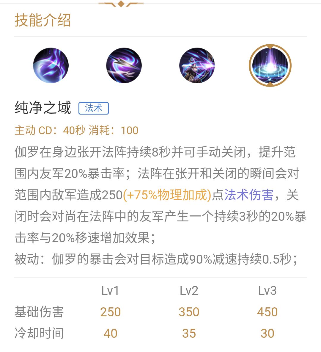 buff技能,主动效果很强,被动效果也不错。团战中尽量早点放。如果晚放,敌人跑了,或者队友死了。基本大招没用了。
