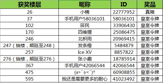 以下,就是活动“打皇冠,赢大礼,皇室真箱抢先拿!”的获奖名单,快来看看有没有你吧~