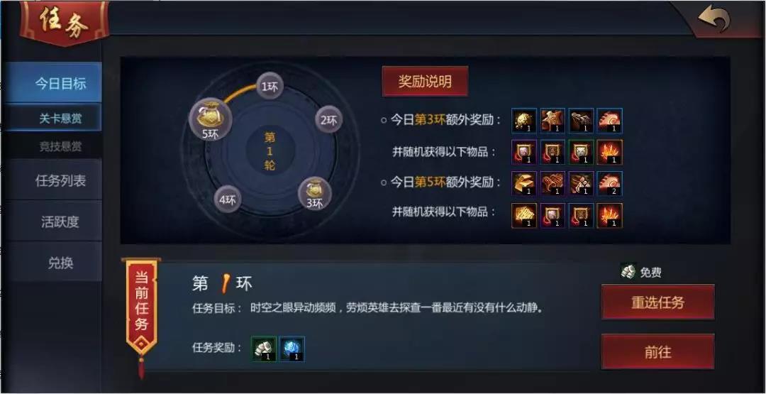 首先映入眼帘的是今日目标,今日目标中包括关卡悬赏和竞技悬赏,这些都是一些每日任务。在关卡悬赏中,还有特殊的跑环任务,不仅能领取每个环的奖励,完成第3环与第5环还能获得额外得奖励,ps:神兵值越高,能获得的奖励也越赞!ヽ( ̄▽ ̄)ノ