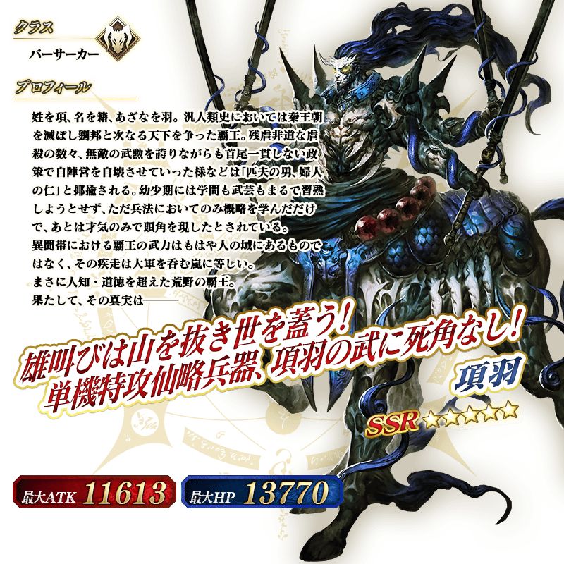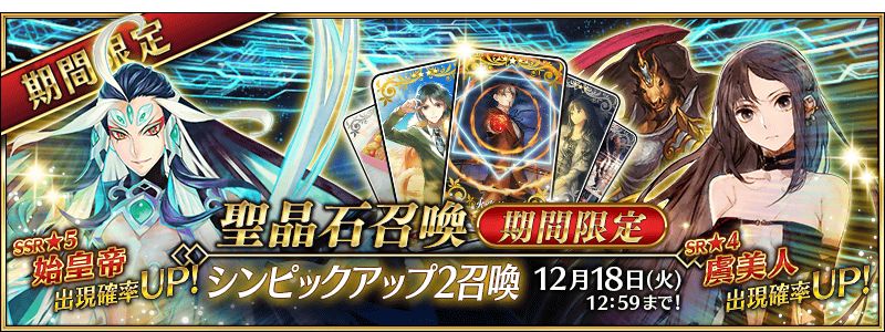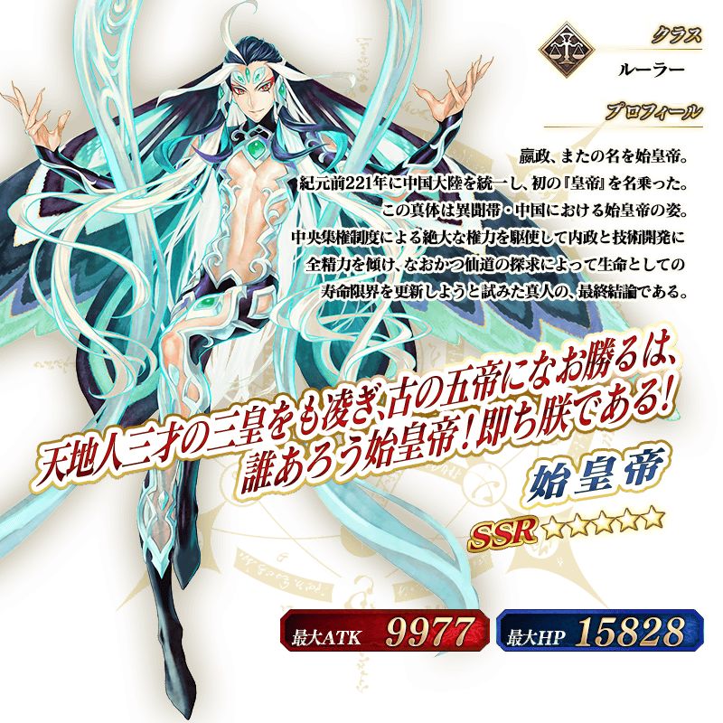 剧情限定:始皇帝,期间限定5星英灵,在非Pick UP时仅能从特定福袋入手.