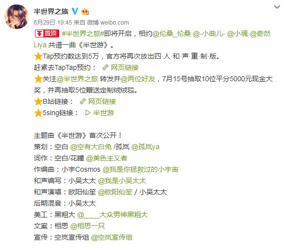 主题曲《半世游》以唯美浪漫的古风歌词和极具东方韵味的旋律,演绎出《半世界之旅》中来自东方异世界的爱恋羁绊。四位男神歌手的深情演唱,也让人不禁有种心动的感觉。不过据了解,主题曲还有另外的四主唱和声重置版,当TapTap游戏预约量达5万时将放出。想听伦桑、奇然、小曲儿、小魂四位大大更完美的和声演绎吗?那就快快预约《半世界之旅》吧!