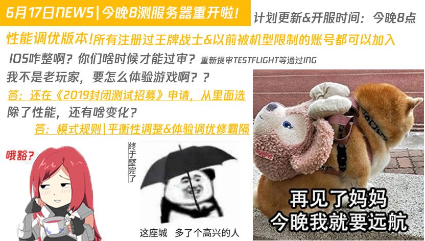 6月初的性能调优已经小规模渡劫,如顺利,我们计划在6月17日(今天)20点左右更新B测客户端,重新开启王牌特训服务器。