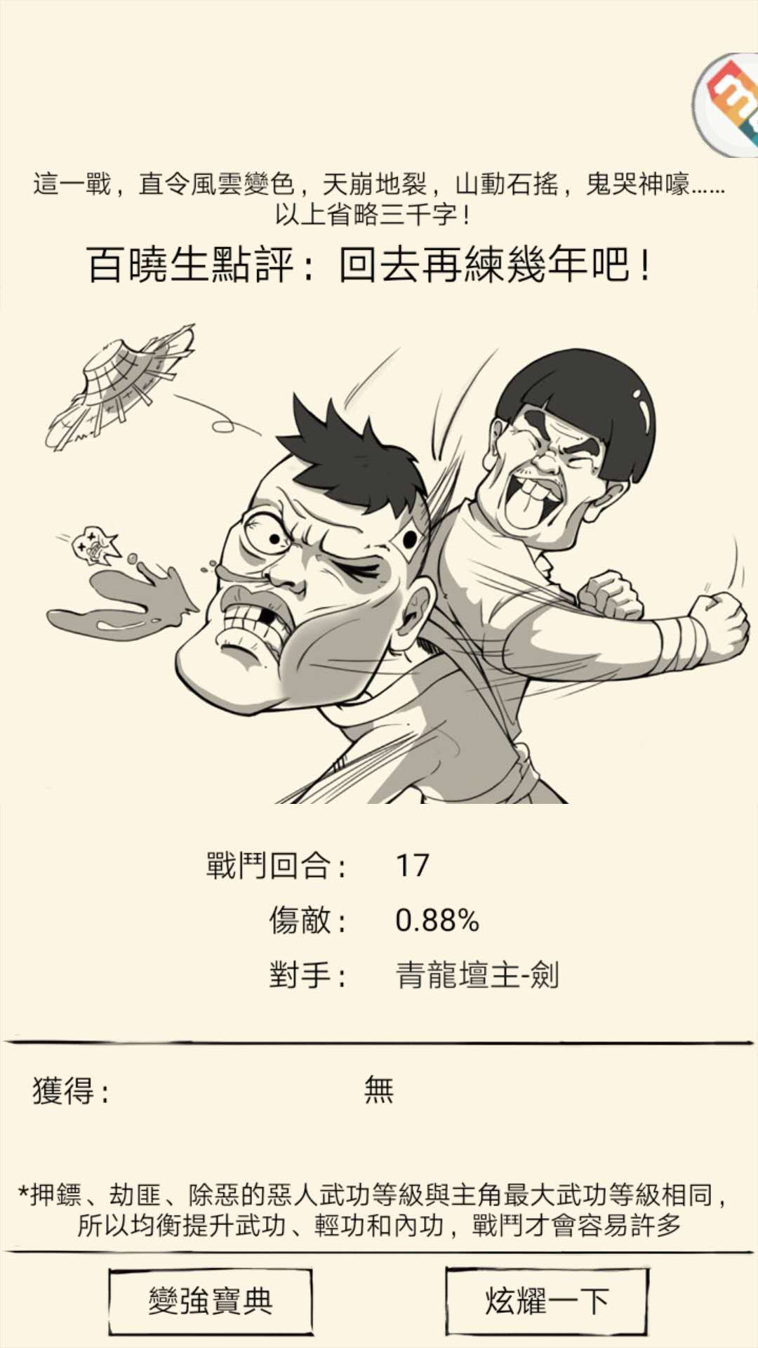 注意:这不但需要你血高防高,还需要你有足够的内力让你能最后用出升龙拳,不然最后一回合只是平A