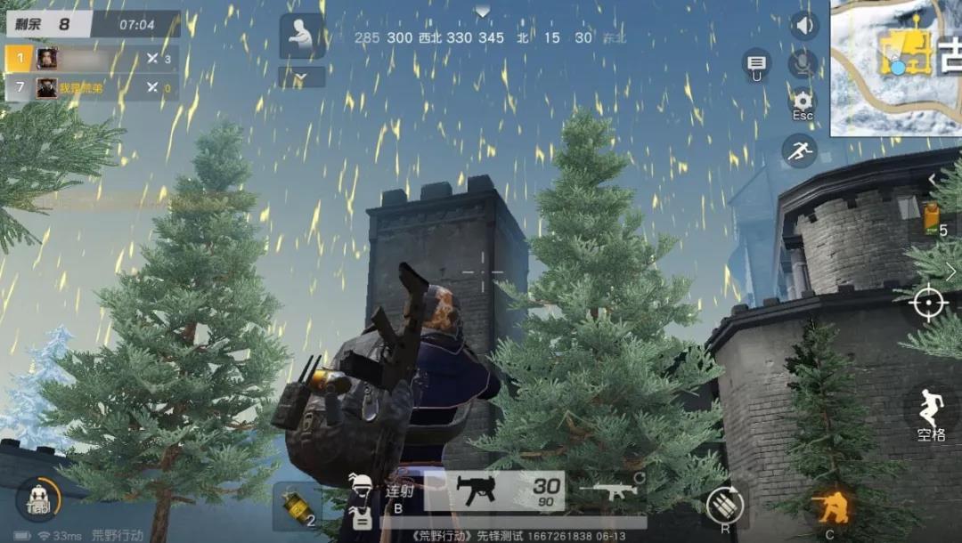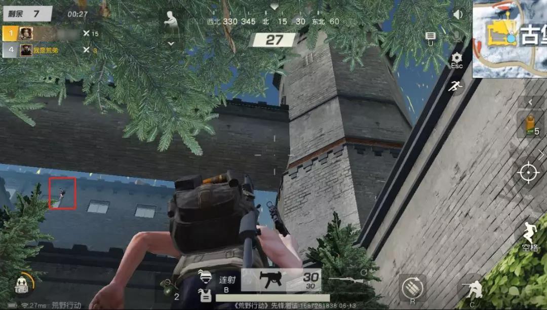 沿着建筑跳跃登上建筑后,我们的视野便拓宽了,这时要找好掩体藏好,并重点观察同层建筑和高层建筑的情况,避免成为他人的空中靶子。
