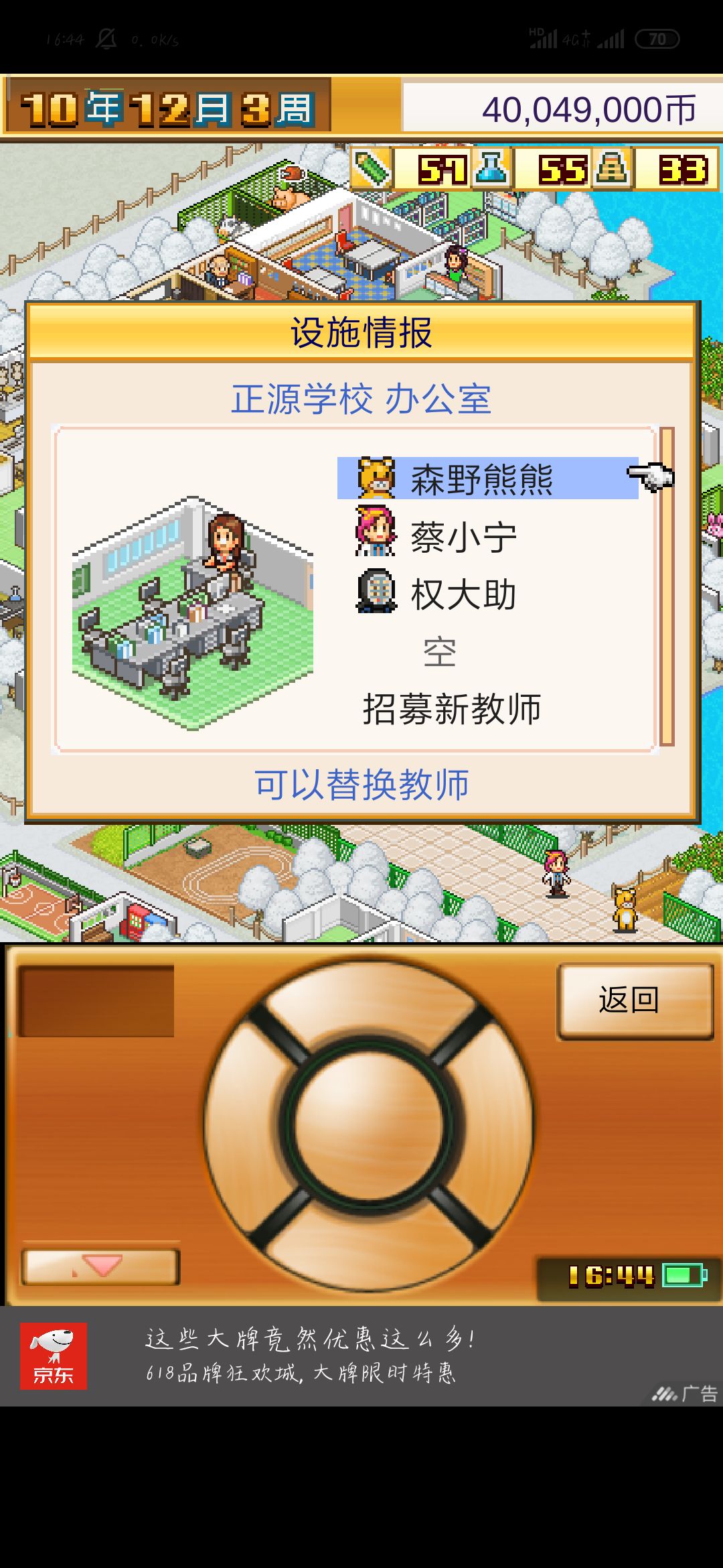 基本上这样,然后最后一点,好老师怎么样才会来,大多数老师和你学校中的人气景点有关,还有一部分和你的学校名气有关,成为名门之后自然会来。不过我的北极猩老师似乎是因为种了很多树,并且菜园子里长了香蕉才来的。
