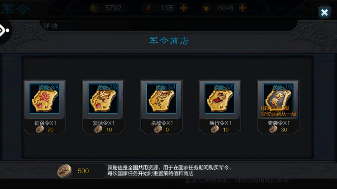 从一品以上都能买令,建议一个国家二个人买令,一个人买令忙不过来,人多也不知道往哪跑。国王和军师买令就行。一级国家只能使用征召令,征召令可以在有己方部队的城池释放,三分钟内本国玩家可以传送到该城池。相当实用。不怕堵路。怎么用得好要靠策略了。第二个复活令,这个令比较鸡肋。可以让大城市变成复活点。看起来不错,但是只能复活三十支部队,令一放,才过几秒发现已经还剩复活次数为零,有时候还碰到捣乱的,不想赢放个复活令在偏远大草原,有的跑了。太鸡肋。第三个杀敌令,这个令可以五分钟内让该城池杀敌数提高100%。对敌人多的城市释放,可以解决国战的十次诏令奖励,很实用,毕竟国战除了输赢奖励外,诏令奖励也是要全部做完的。第四个疾行令。很实用,五分钟内玩家移速和募兵速度提升。在路没有堵住的情况下。可以一直先放疾行。第五个奇袭令,这个令可以让己方占领的暗道连接。五分钟当正常道路使用。这个令,看起来很厉害,打暗道过去,但是需要地理条件,往往对面城池都是敌方。施放奇袭令也就减少了路程,用好这个令比较难。