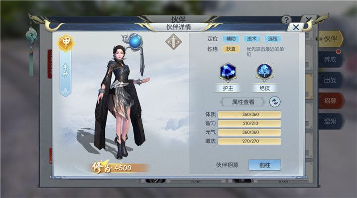 我们点击游戏界面的右下角可以看到伙伴按钮,在这里我们可以看到所有已经拥有和未曾拥有的伙伴。朱砂是甲级橙色伙伴,定位是辅助、法术和远程,是一个可以为阵容提供法术伤害伙伴。朱砂性格是耿直,会优先攻击最近的单位。朱砂是一个以生命值和防御见长的伙伴,所以大家在伙伴出阵的阵形中可以将朱砂放在阵容的前排。