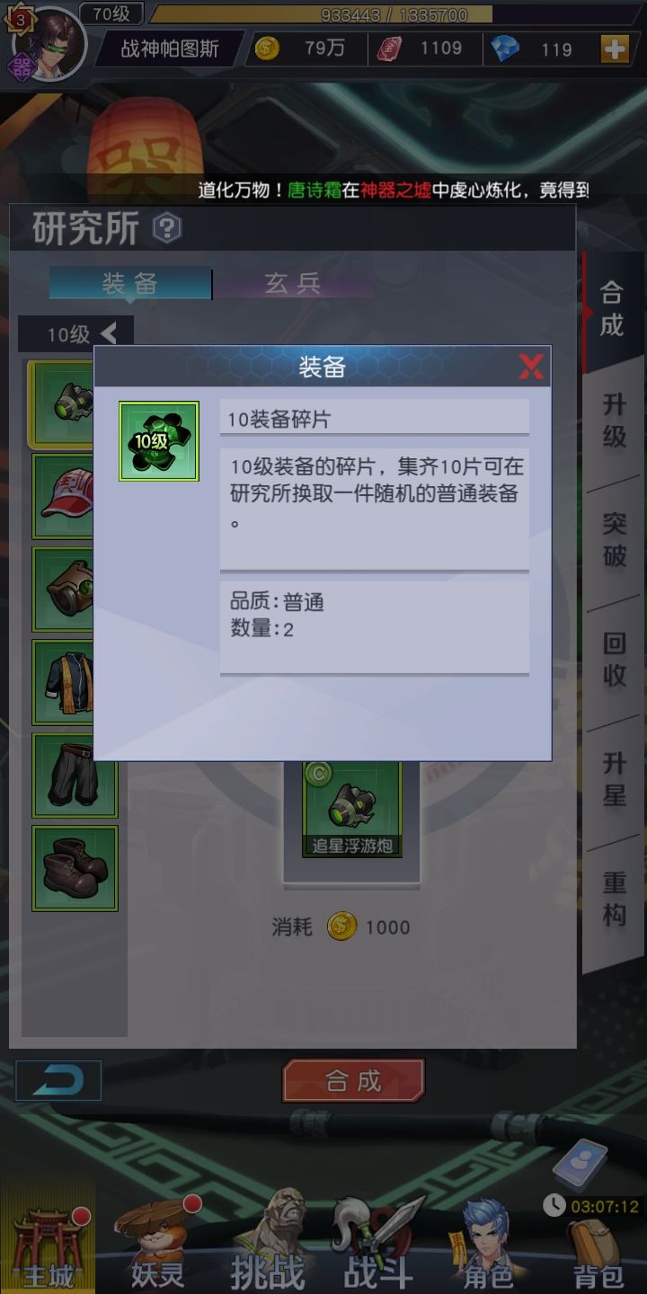 10级装备碎片拥有10个小碎片即可合成一件10级装备,合成时稀有度随机分为4个等级,C级装备没有多大用处,B级装备可以用来作为过渡的,A和S这两个装备就比较稀有。不过10级这个等级很快就会被淘汰所以不必太放在心上。