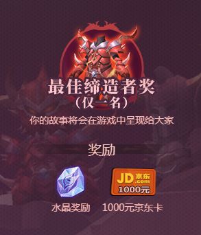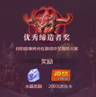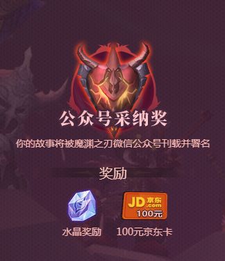 此次魔渊世界大建设活动选出的优秀内容将公开展示,并且接受玩家投票,结合审核组和玩家投票意见还将产生几档不同的奖励,分别是公众号采纳奖、优秀缔造者奖、最佳缔造者奖(一名),获奖者除了故事将被魔渊之刃微信公众号刊载并署名之外,还会获得水晶、京东卡等不同档次的奖励。