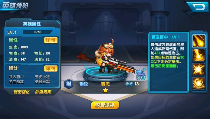 百发百中:攻击敌方最虚弱的敌人造成物理伤害,附加457点物理攻击。