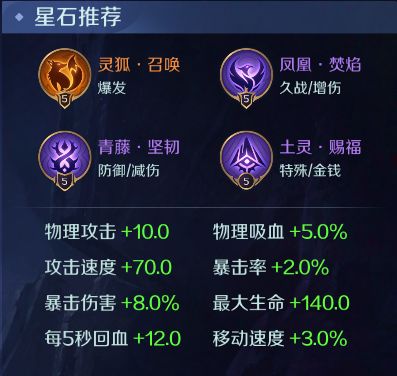 蓝绿星石首选攻击速度与物理攻击配合黄月英的被动形成爆发能力。紫色星石推荐凤凰,青藤,土灵,保证一定的生存能力的同时,提升自身爆发力和更快的发育速度。
