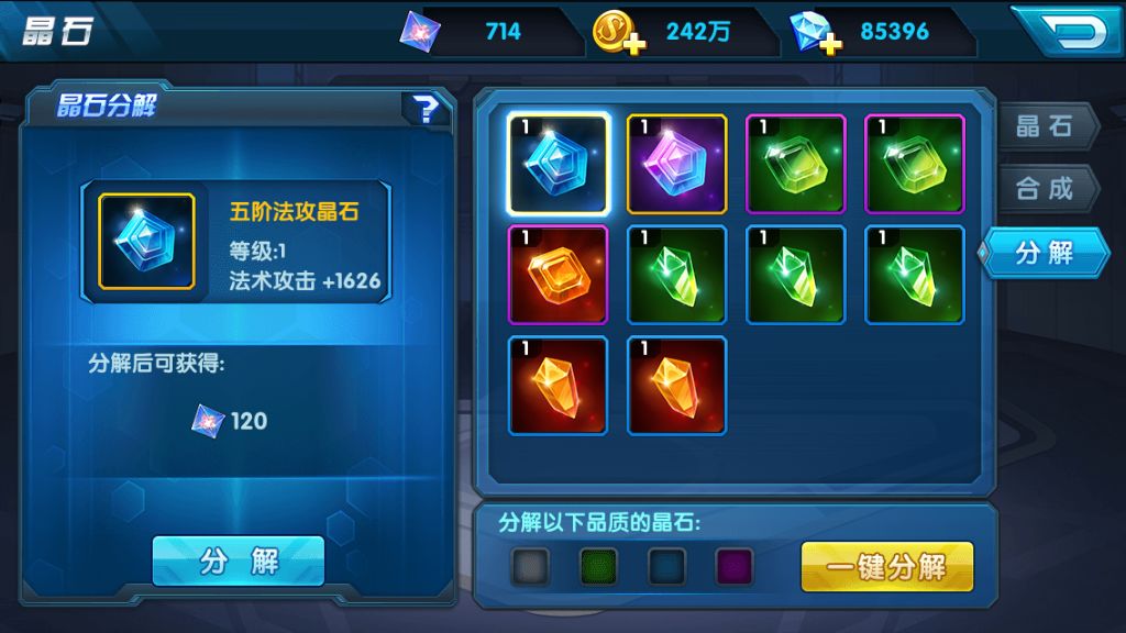 在玩家拥有多个晶石时,可以将无用的晶石进行分解,来获得为晶石升级的晶石能量,越高等级的晶石分解后获得的能量也就越多