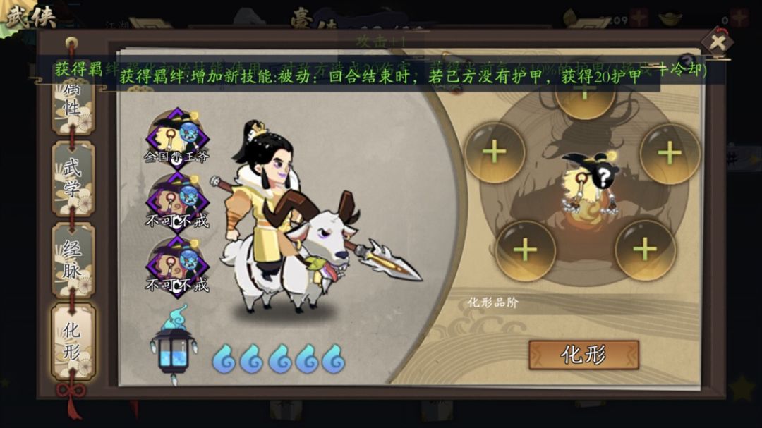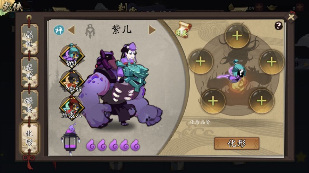 「豪侠」我只玩过自残,没有化形也能打历练,优先度不高,不过为了做不可不戒的青瓷紫化形,还是多做了一件金国小王爷的青瓷紫。其他角色的蓝化形当升紫材料用。