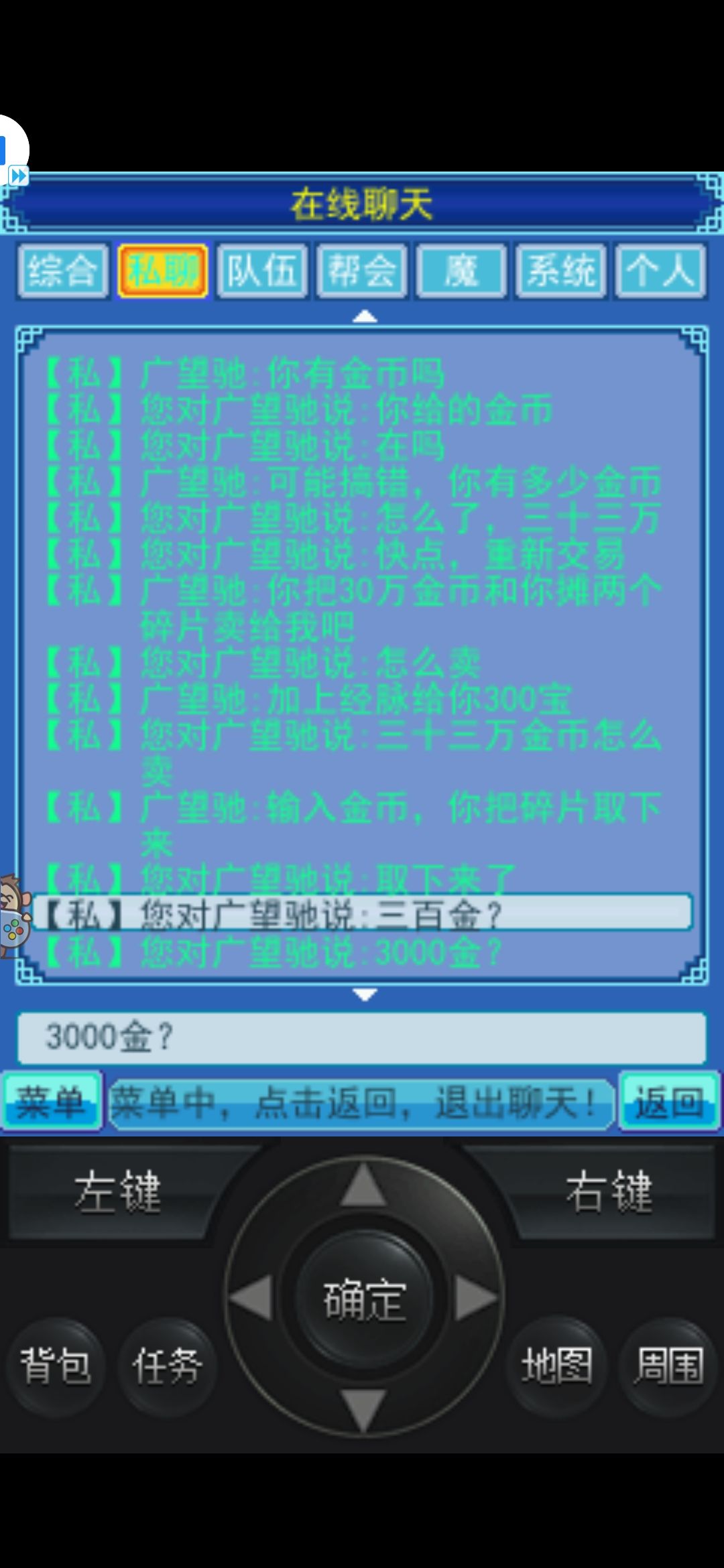 一开始我有两个经脉他给了我八十金币,本来在公屏上说一个四十宝,结果八十金币,到后来他又得寸进尺,想骗我两个藏宝图碎片,和我仅剩的33万金币