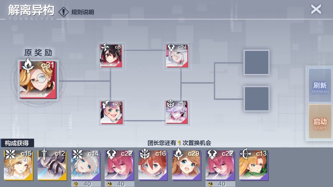 左边的角色是你抽出来的,中间四个是池子里可能会被换到的角色,池子可以无限刷新,刷到一个好池子就点击启动吧