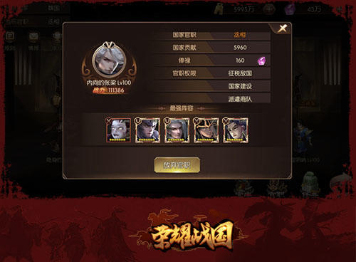 在《荣耀战国》的国政系统中,同一国家的玩家可以谋求本国官职,官职小到郡守、大到国君,官职众多,先到先得。拥有官职后,每天都可以领取俸禄,俸禄是实实在在的水晶,官职越大,水晶越多。