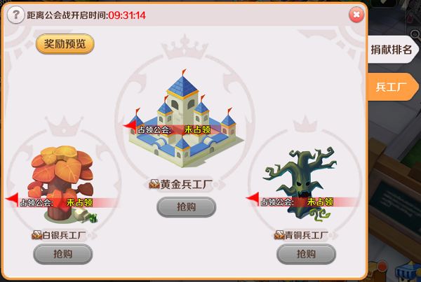 游戏时间到达后,三个地图分别根据公会总积分进行排序,公会积分最高的公会获得该地图兵工厂的所有权,每个公会只能拥有一个兵工厂的所有权(如果A公会同时获得了多个地图的第一名,优先取最高优先级兵工厂的所有权,低优先级地图其他公会的排名依次前移)