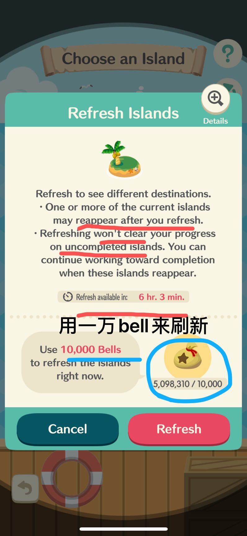 —如果等不及,可以用bells 💰来立即刷新,一次10,000 bells ,