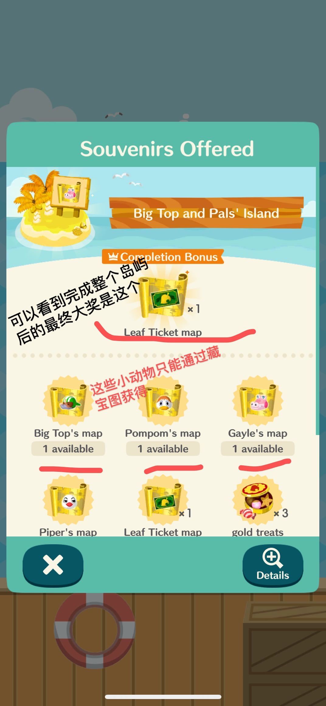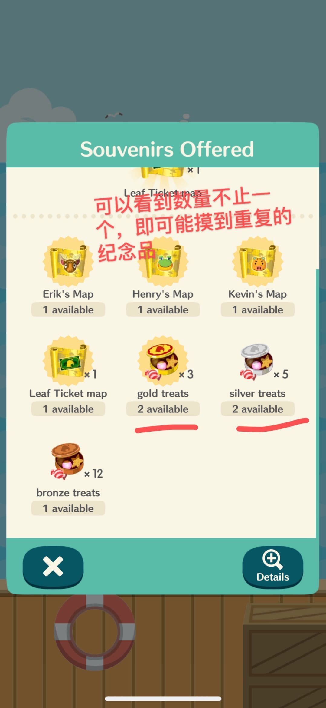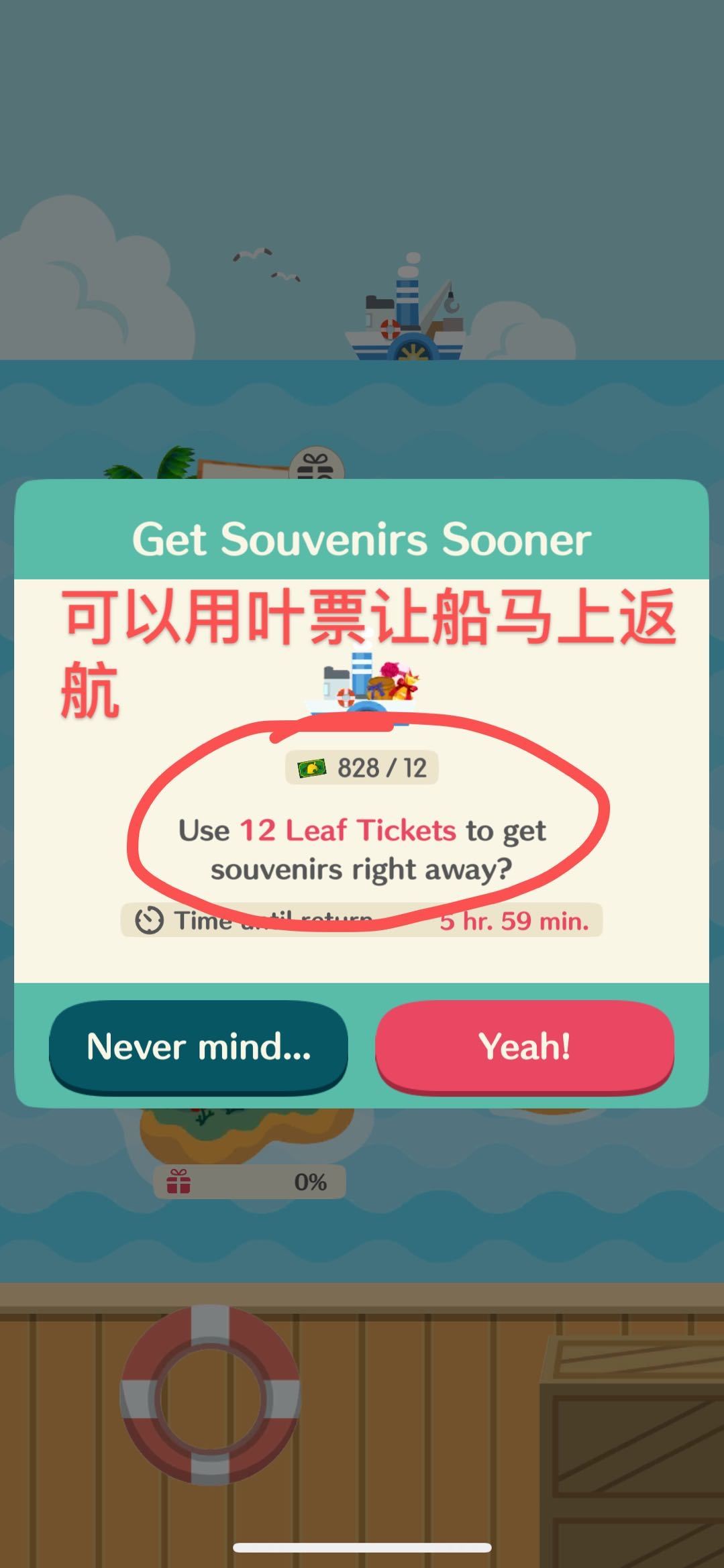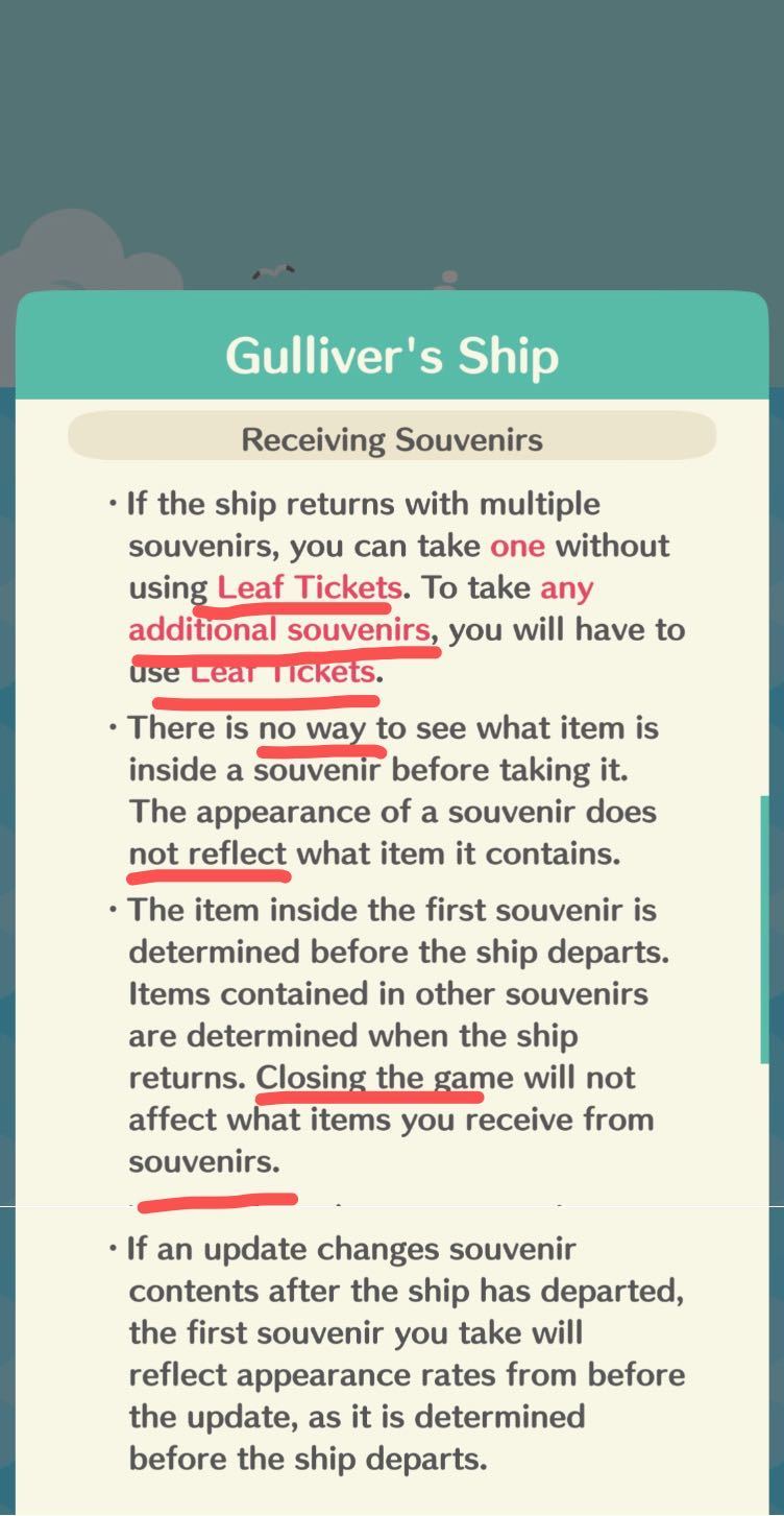 —如果船返回时带来多个纪念品,第一次挑选纪念品是免费的,但是如果像挑选剩下的纪念品就需要支付叶票,(第二次挑选是12叶票,第三次是8叶票,第四次是...别问我是怎么知道的,血泪😭)
