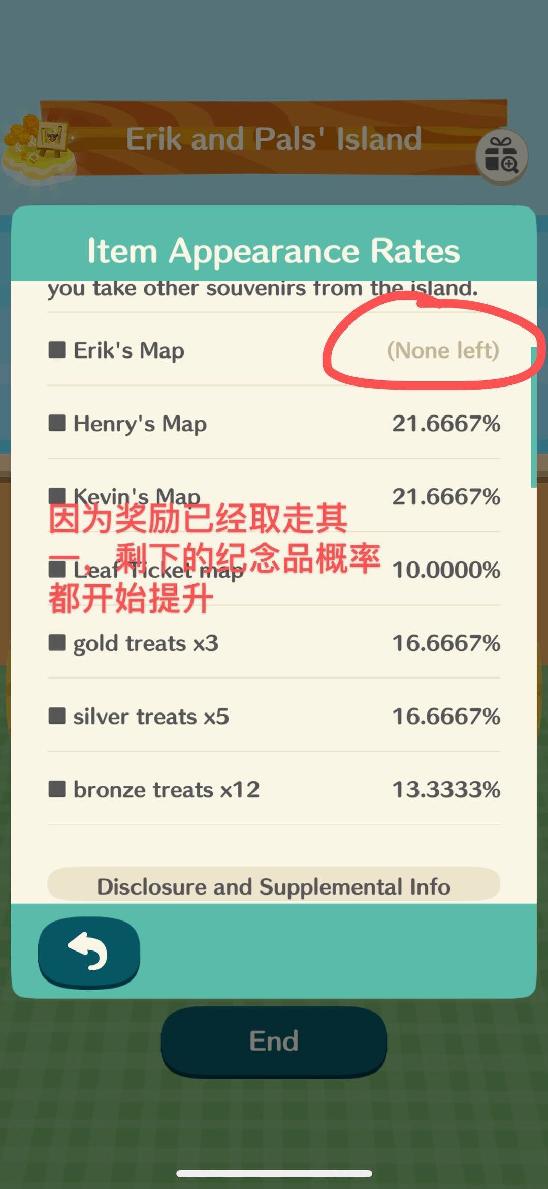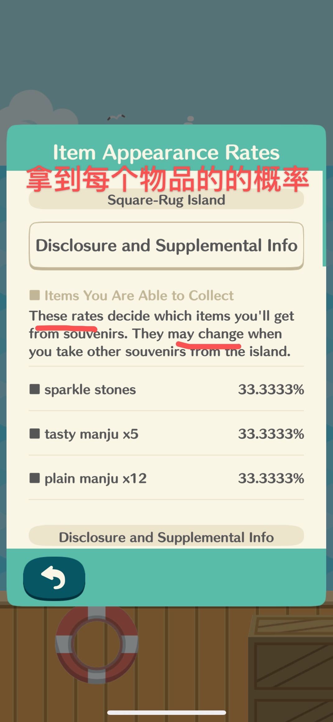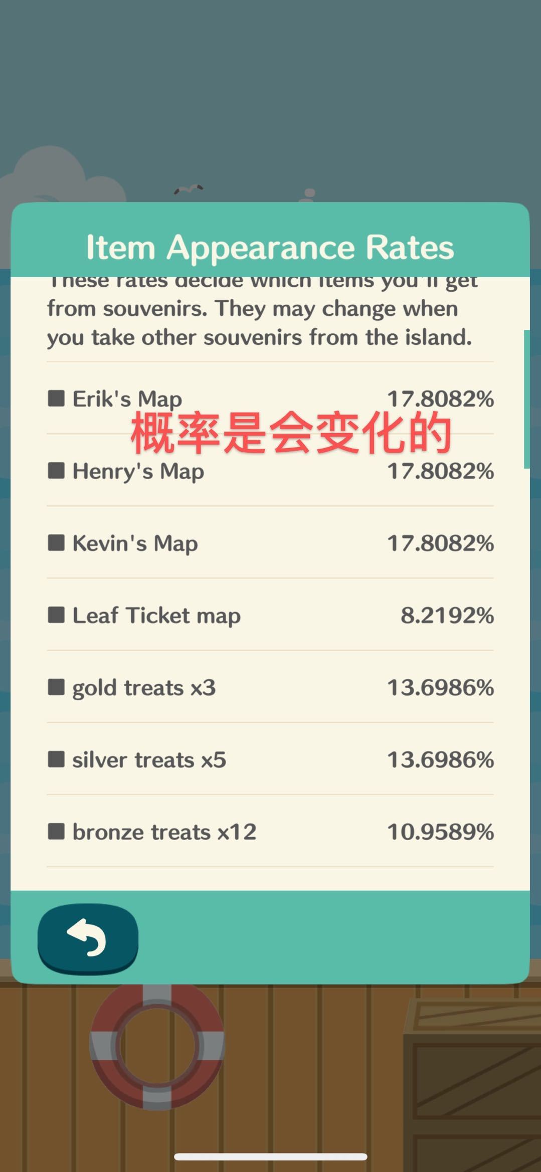 —出现率将根据岛上剩余物品的数量而变化,(比如其中一个纪念品被拿走了,会让剩下物品的概率提高)