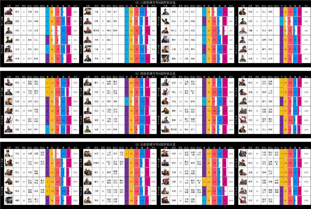 4、如果采用单武将单刷3级地的方式升级,需要合理安排好前期主力队伍轮刷升级时和铺路队伍的共用位置冲突(S3下阵武将不再返还预备兵,只返还80%资源)。