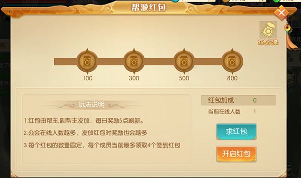 每当有帮派成员完成成就时,则会免费在帮派发起红包,让帮派成员领取,帮派成员越多,能领取的红包则越多哦;
