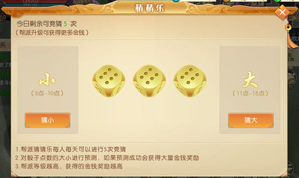 玩家可以选择“大”“小”,选好之后系统会随机出现点数,猜中即可获得大量银两奖励,猜错不要怕也会有安慰奖;