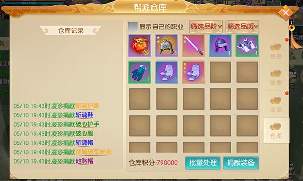 帮派成员可将不需要使用的装备捐献到仓库中,捐献装备之后可获得仓库积分,帮派积分也可以兑换帮派仓库中的其他装备,方便帮派成员交换装备;