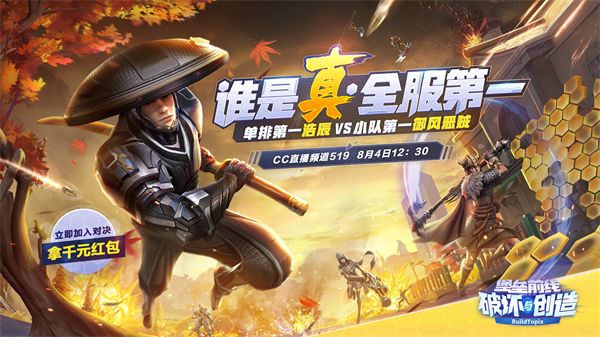 除了以上两大环节外,《堡垒前线》在8月4日12:30,为喜爱游戏的探险家还准备了一场特别的赛事。那就是“谁是真·全服第一”水友赛!届时,全服单排第一浩辰将在CC直播频道519对阵小队第一御风恶贼。来自全服各地的水友也将加入战斗,赢取前缘红包大奖!究竟谁能成就全区第一的荣耀呢?8月4日,答案就将揭晓!