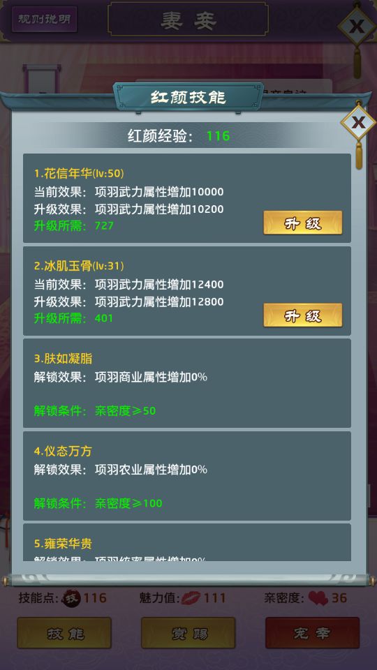 3.在没有妻妾技能的加成下,任何典籍,无论用在哪个幕僚身上都是直接的加成。综上3点,大家要明白,中后期想要用最低的资源消耗换取势力提升的最大化只有一个办法:集中资源提升一到两个有妻妾的幕僚。