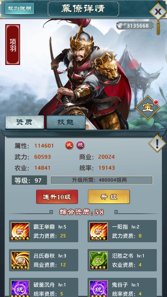 2.无论资质多少,任何幕僚由低级升到高级所需银两是一样的,即我用1个亿银两把17资质的李元霸和13资质的程咬金从1升到150级总共所增加的势力,和我用5千万银两把30资质的武汉超所增加的势力是一样的。