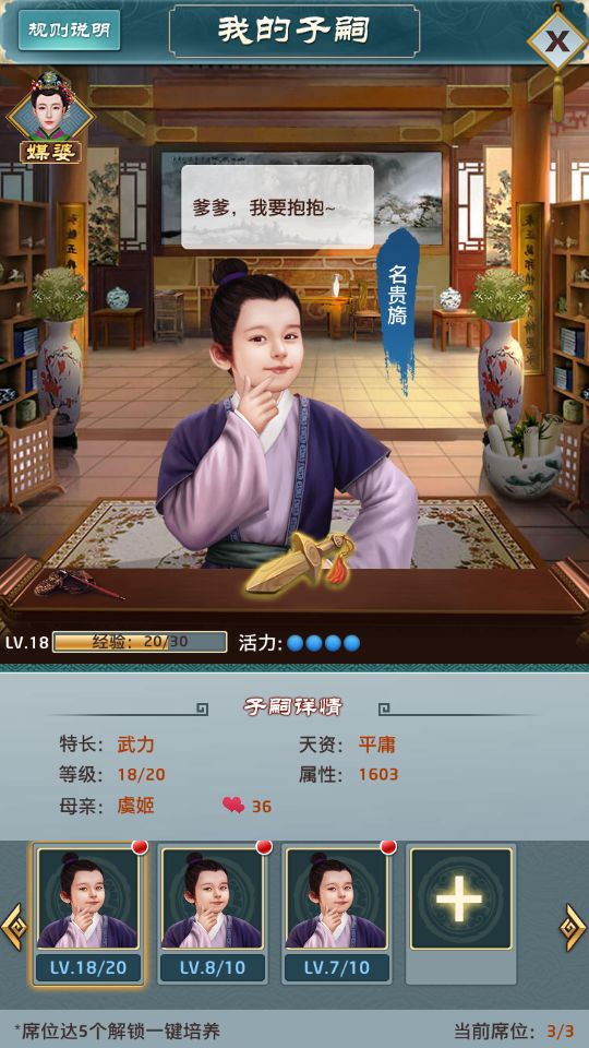 答:那是因为你和妻妾的亲密度不高,亲密度越高,生出来的孩子资质就越好。目前孩子有五种资质,分别是笨拙、平庸、聪慧、睿智、神童。PS:VIP等级会影响生孩子的概率,vip等级越高生孩子的机率就越大。而且第一个妻妾(薛灵芸)最容易生出孩子(在同等亲密度或亲密度相差不大情况下)。