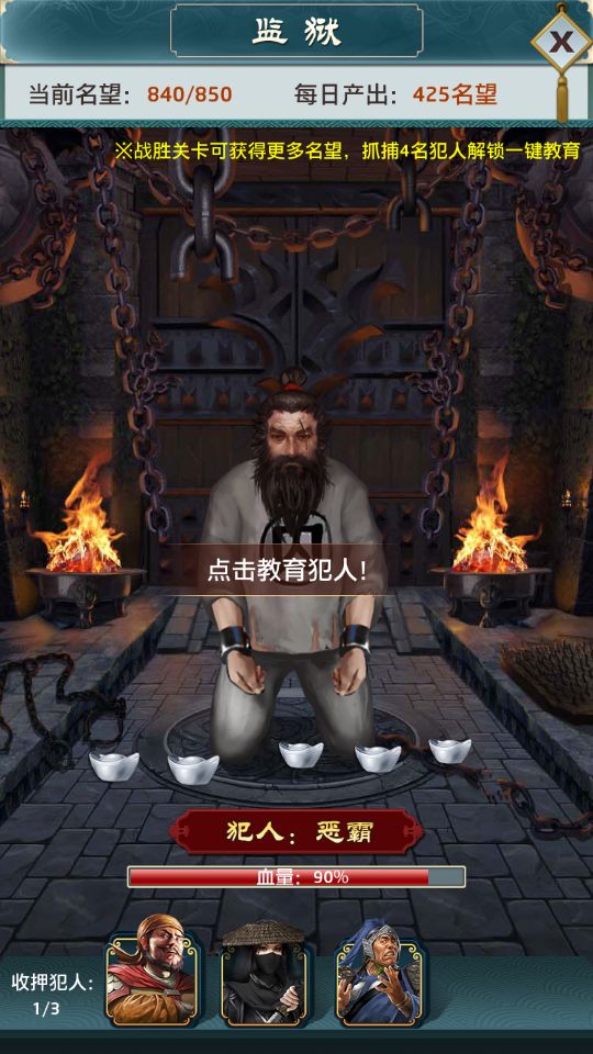 抓获的犯人可以在监狱中进行惩罚,每次耗费10名望,可以获得粮食、金钱、各种丹药、加好感和颜值的道具、元宝、强化卷轴等等。每个犯人被惩罚后扣除的血量不一样,每打光一个犯人的血量才能继续惩罚下一个。而且每个犯人掉落的物品也不一样,越排在后面的犯人掉落的东西越好。名望会在每天凌晨根据你自己的每日产出量(也跟通关数有关)增加,当天剩下也会保留,除非达到上限。