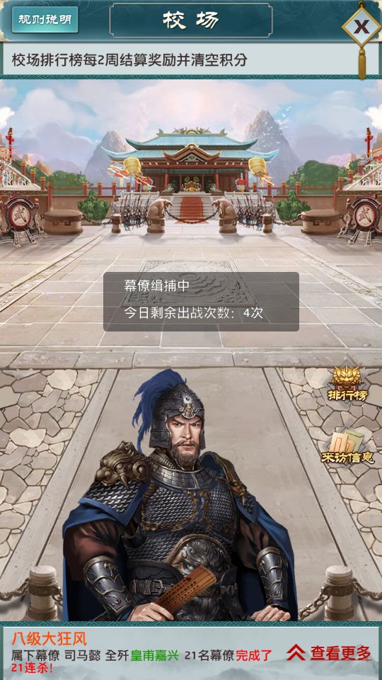 校场每天可以出使四次,目前出使的幕僚是系统随机选择你所有满60级的幕僚,所以如果你不想数值很弱的幕僚出战,你最好不要把他们强化到60级。